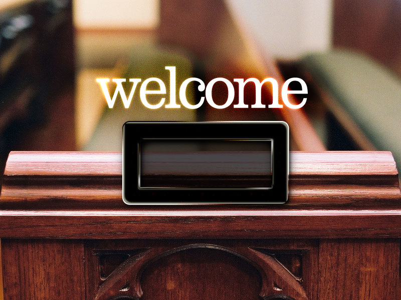 Greeting and confirmation check-in screens used for our Fellowship One database system. The background image is a detail the end of a pew in the chapel.